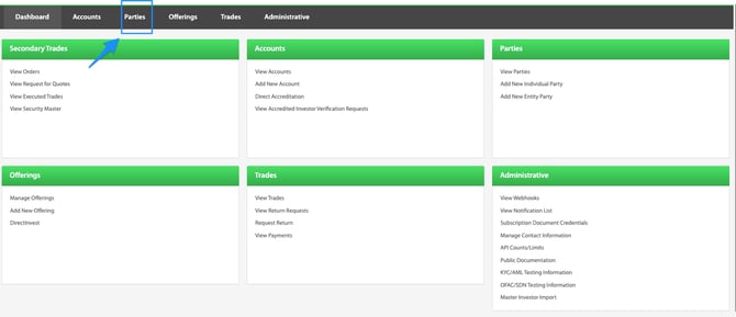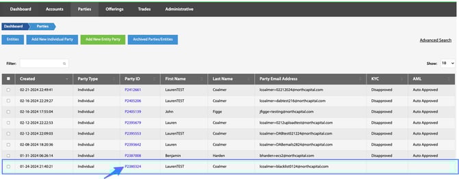 From the Dashboard, navigate to the Parties page, then find and select the hyperlink for the desired party.